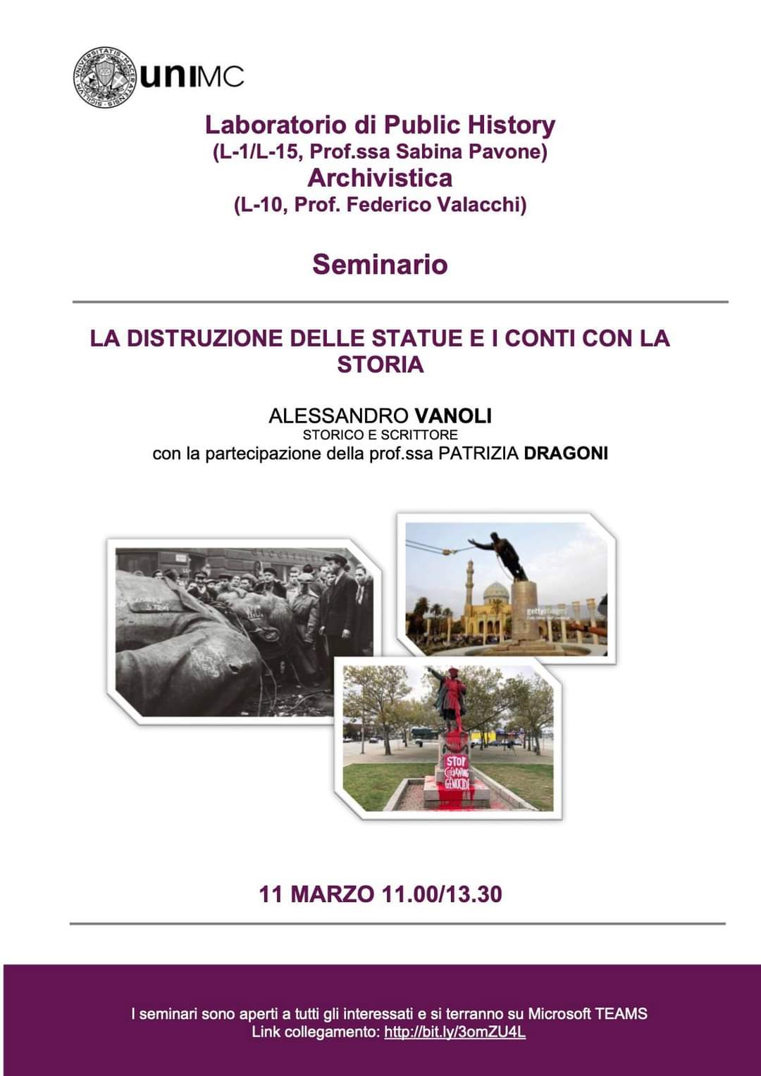 Il seminario di Alessandro Vanoli, storico e scrittore, intende interrogarsi sul fenomeno della distruzione delle statue al centro del dibattito pubblico, per inquadrarlo in una prospettiva storica. L'iniziativa, che vedrà anche la partecipazione della prof.ssa Patrizia Dragoni, si colloca nell'ambito del Laboratorio di Public History della prof.ssa Pavone e del corso di Archivistica del prof. Valacchi.